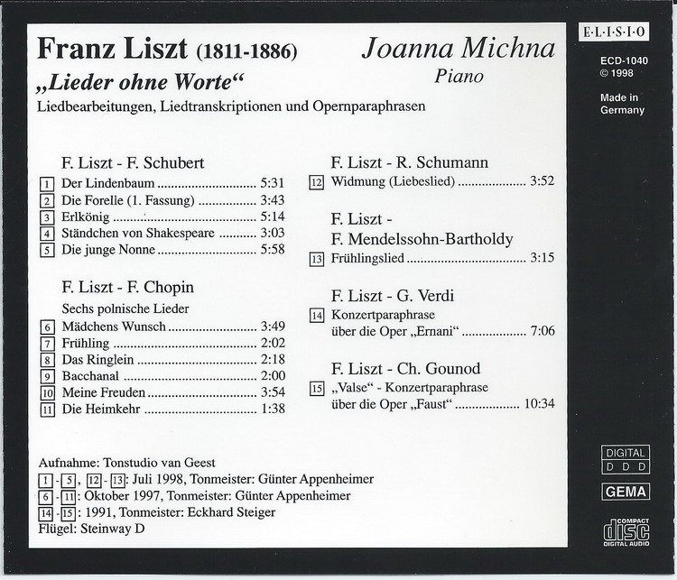 LISZT LIEDER OHNE WORTE Schubert Chopin Schumann Mendelssohn Verdi - Gounod