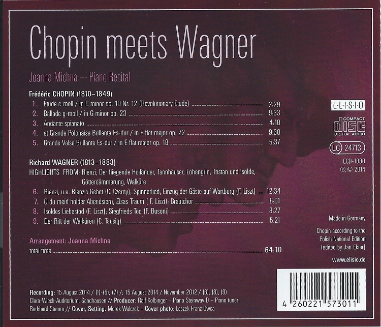 "... besonders die effektvollen Transkriptionen von Carl Tausig (Walküren-Ritt und Siegmunds Liebesgesang) sowie Ferruccio Busonis Fassung von Siegfrieds Tod einen starken Eindruck hinterlassen. Joanna Michna zeigt sich in dieser Einspielung erneut als sehr versierte Pianistin, die es bestens versteht, Melodien auf den Tasten kantabel zu gestalten. Auch den orchestralen Anforderungen der Transkriptionen, die sie in vielen Farben leuchten lässt, wird sie wunderbar gerecht."